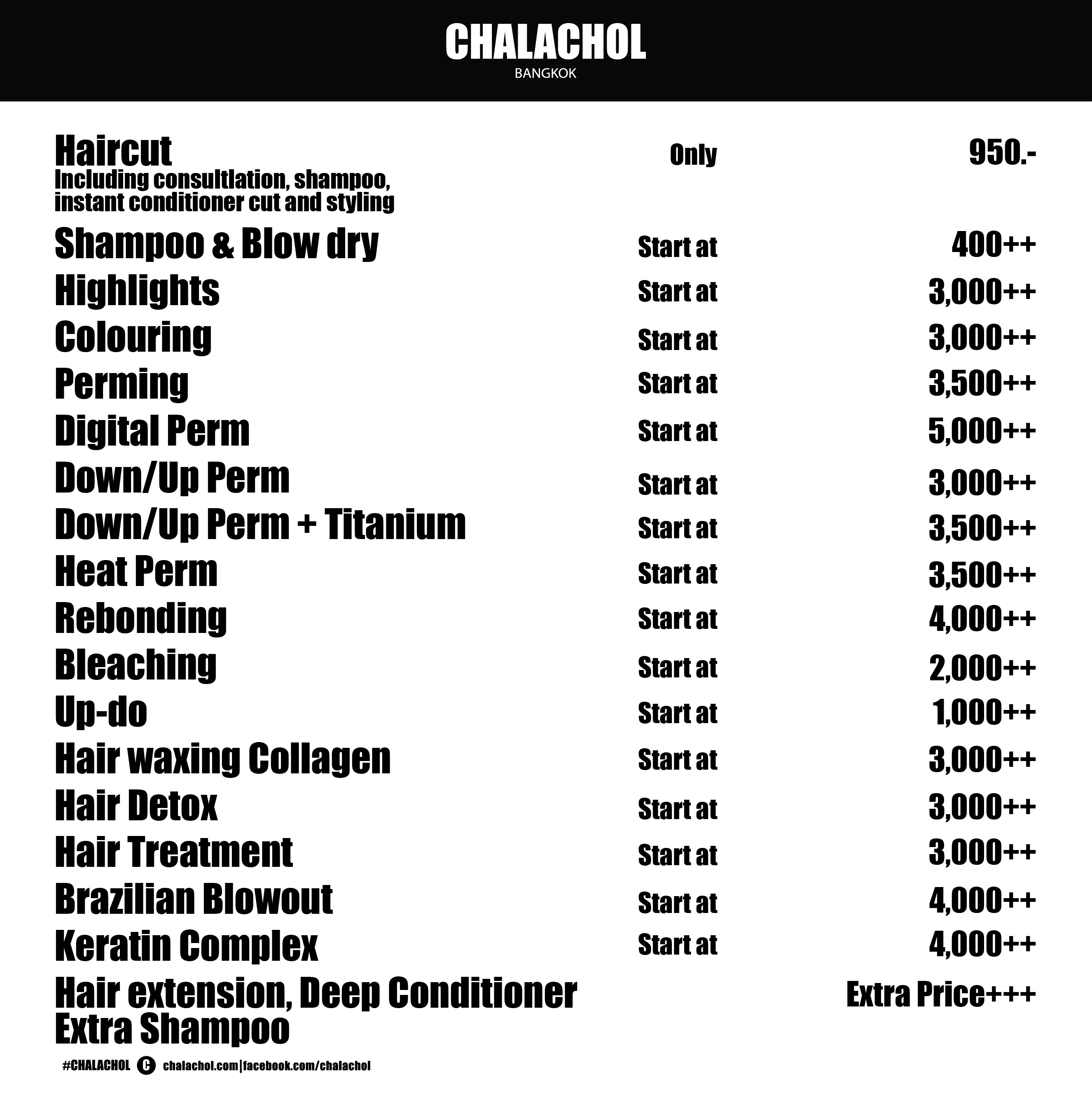 ราคาค่าบริการทำสี ดัด และยืดขึ้นอยู่กับความยาว ความหนา สภาพเส้นผม และผลลัพธ์ที่ต้องการ โปรดไปที่ร้านเสริมสวยล่วงหน้าเพื่อพูดคุยกับสไตลิสต์ของเราเพื่อขอคำแนะนำและใบเสนอราคาขั้นสุดท้าย